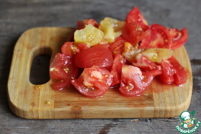 На помидорах сделать крестообразный надрез, обдать кипятком и снять кожицу. Крупно нарезать.