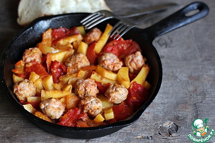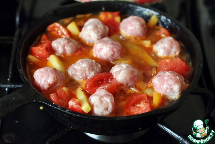 Добавить помидоры к овощам, всё посолить и поперчить, немного протушить (дать выделиться соку). Фарш посолить, сформировать небольшие шарики и поместить к овощам, немного "утопить" их в подливке. Если сока (жидкости) в сковороде мало, можно добавить немного воды.
