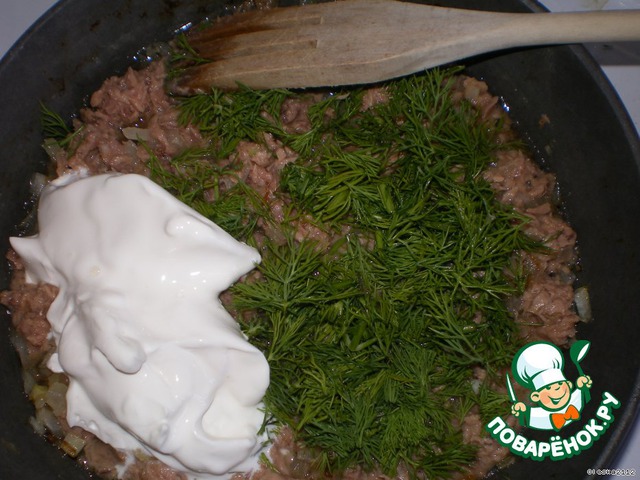 В сковороду с обжаренным луком добавить размятые рыбные консервы (у меня тунец) вместе с жидкостью, зелень укропа, сметану и тушить 3 минуты.