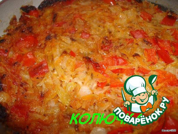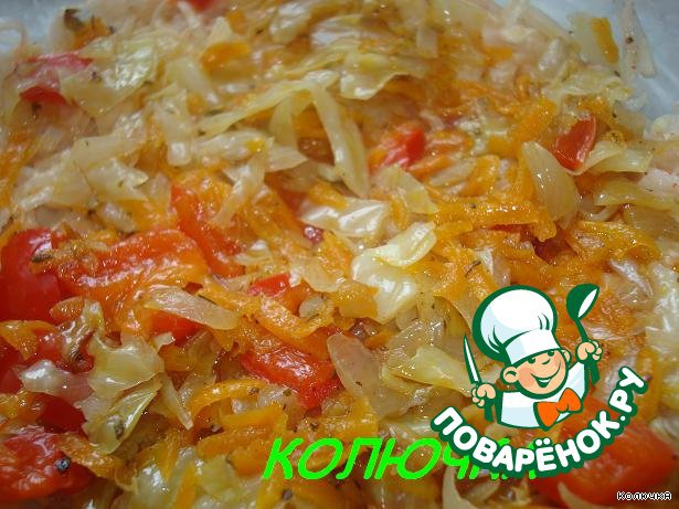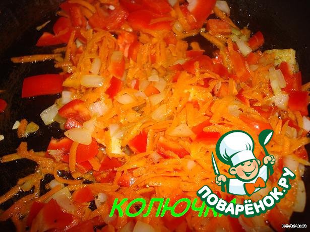 лук и перец режем мелко, морковь трем на терке, капусту тоже мелко рубим и тушим