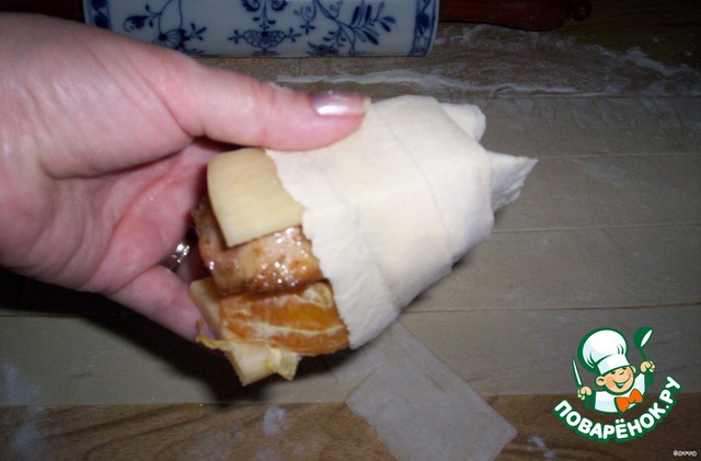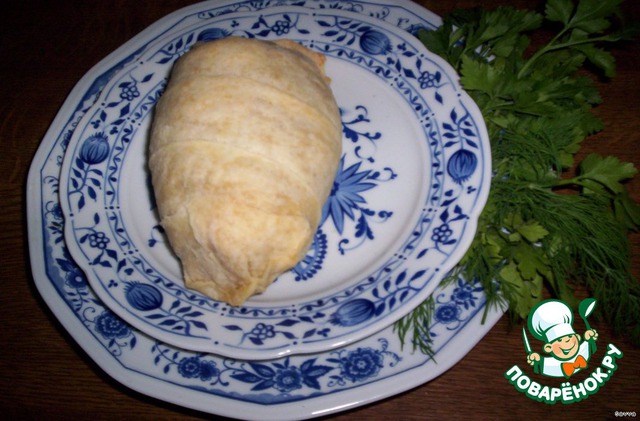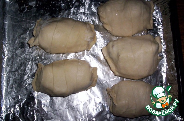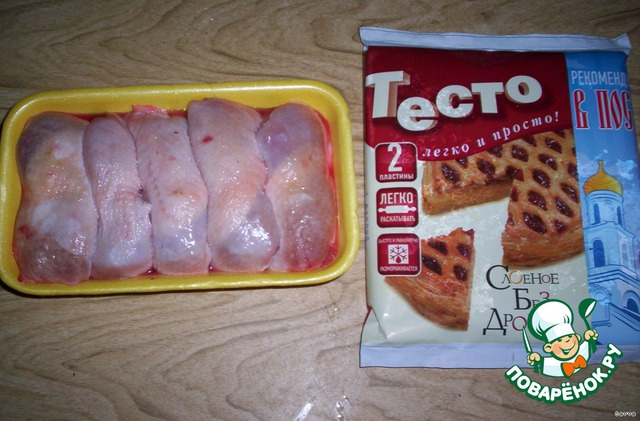 | В меню субботнего обеда были запланированы "Ножки в тесте"- вкусное основное блюдо. Купила слоеное тесто, а оно, как оказалось, не подходит для рецепта (тесто расплылось, время приготовления увеличилось в два раза). Вот какие получились ножки... |