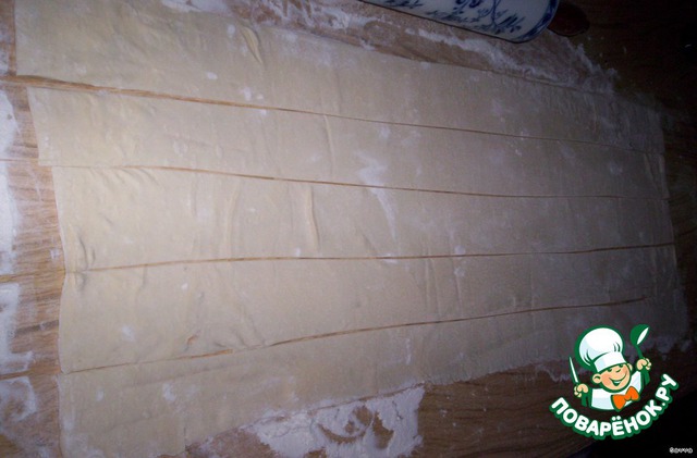 - тесто раскатать, разрезать на "ленточки" по 3 см шириной :\’ (