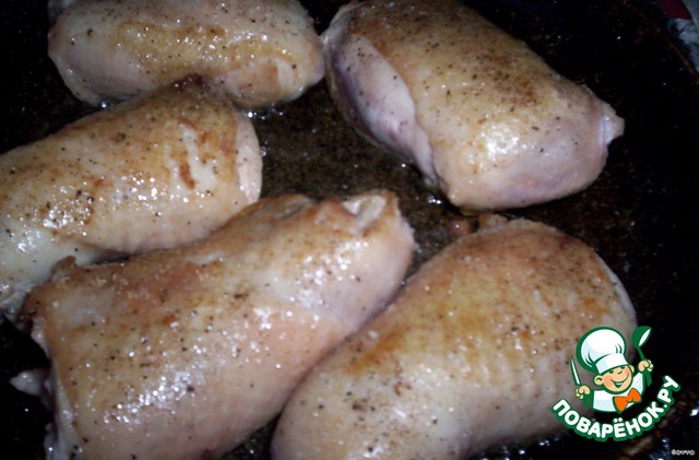 - куриные ножки посолить, поперчить, поджарить до готовности на разогретой сковороде без добавления масла (ножки пустят свой сок) :\’ (