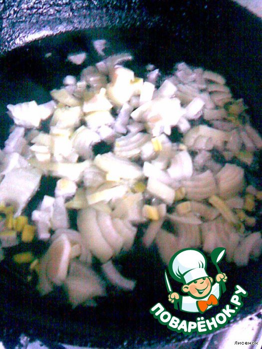 Лук нарезать не сильно мелко (я нарезала на 2 части, а половинки на три и дальше полосками) и обжарить на растительном масле