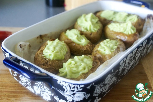 Далее, выбранную мякоть можно превратить в пюре, добавив, например, молоко, яйцо и тертый сыр или просто разбавив водой. Начинить картофель полученным пюре через кондитерскую насадку и зарумянить в духовке. Получится очень красиво и вкусно. Но я предлагаю пойти еще дальше.