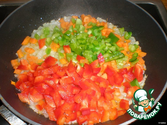 обжариваем мелко порезанные:лук,морковь,перец,мясной фарш,петрушку.Солим,перчим.Для связки массы я добавила одну ложку соуса бешамель(это по желанию)можно обойтись и без него.
