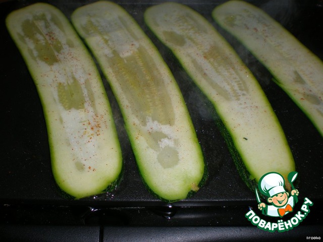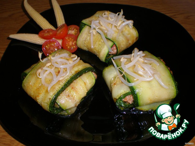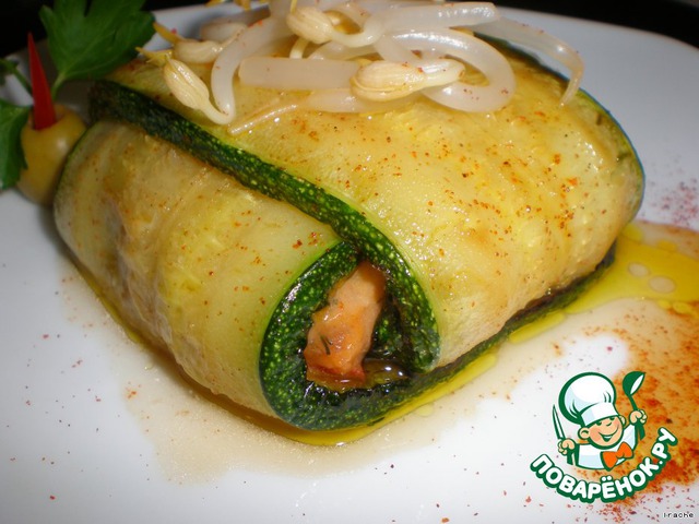 ложим два поджаренных кабачка в форме креста(один на другой),на середину выкладываем готовую начинку и закрываем поочерёдно концы.Затем переворачиваем