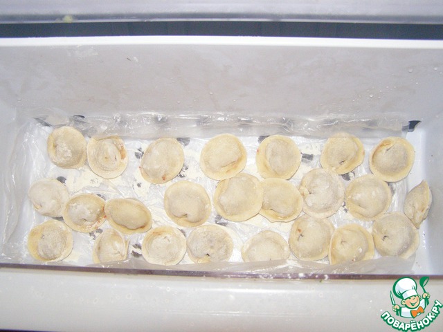 Замораживаем пельмени в морозилке. Для этого выстилаем дно морозильного ящика пакетом или бумагой для выпечки и посыпаем мукой.
