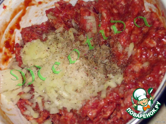 Добавляем сливочную смесь в фарш, соль, перец и хорошенько вымешиваем,
