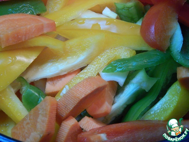 Затем на обжаренного кролика выкладываем крупно нарезанные овощи, солим, перчим по вкусу, добавляем 1 мультистакан воды. Закрываем крышку и выбираем режим "Тушение".