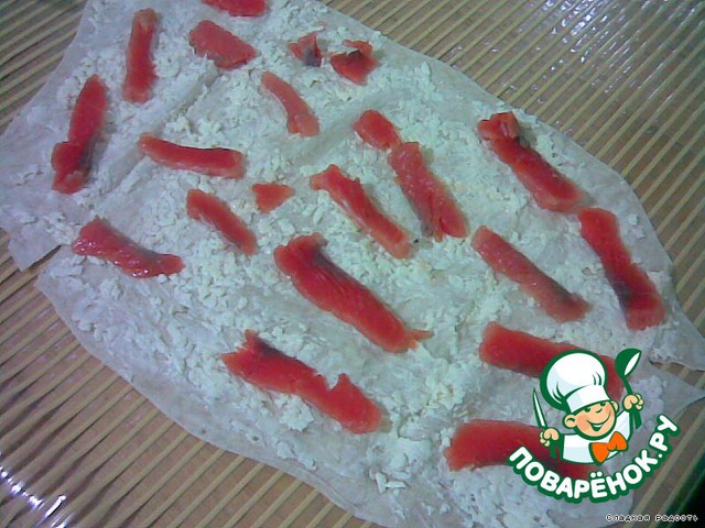 | Замариновала сeмгу, еле дождалась когда она приготовится, а когда свершилось ЧУДО, окозалось, что хлеба в доме нет))) Пришлось придумывать чем заменить и тут под руки попался один листик лаваша. |