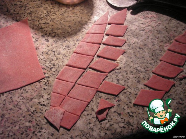 Обрезки теста мне было лень месить и катать. Я нарезала их ромбиками. Будет что-то типа лапши :-)