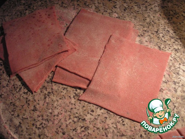 Для лазаньи нарезать тесто на прямоугольники по размеру формы в которой будете запекать. Я нарезала на небольшие прямоугольники. Буду делать каннеллони :-) (закручу потом эти прямоугольники в трубочку)
