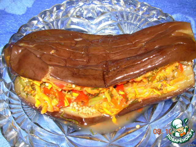 Все делала на глаз, поэтому не обессудьте. Баклажаны целые отварить минут 5 -10 в подсоленной воде. Прокалывая иголкой возле хвостика, так как там самая твердая мякоть. Отварить до мягкости, но не переварить. Остудить. В это время натереть морковь, для идеала на терке для корейской моркови. Перец порезать на тонкие полоски (или потереть на крупной терке), выдавить чеснок через чесночницу, добавить соль, перец по вкусу. Разрезать баклажаны вдоль на пополам. На каждую половинку положить начинку, соединить половинки. Приготовить маринад: вода, соль, лавровый лист - на глаз, залить баклажаны, положить под гнет (сверху накрыть тарелкой и положить груз в виде литровой банки). Оставить при комнатной температуре на 2 дня. Потом хранить в маринаде, в холодильнике. Приятного аппетита!