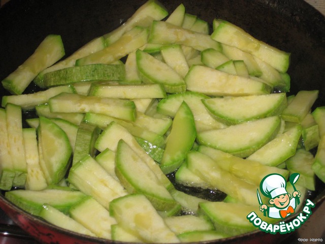 Кабачки крупненько нарезать и также обжарить на растительном масле.