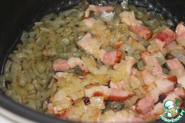 Бекон режу полосками, лук - кубиками и обжариваю до прозрачности лука. Моя мультиварка прекрасно справляется с обжариванием продуктов