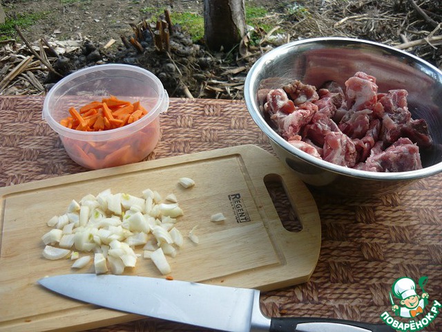 Итак, из продуктов берем: растительное масло, мясо (рёбрышки свиные), морковь, репчатый лук, предварительно замоченный на ночь горох, лавровый лист, пшено, соль, молотый перец, сало свиное, чеснок, побольше петрушки и зеленого лука.