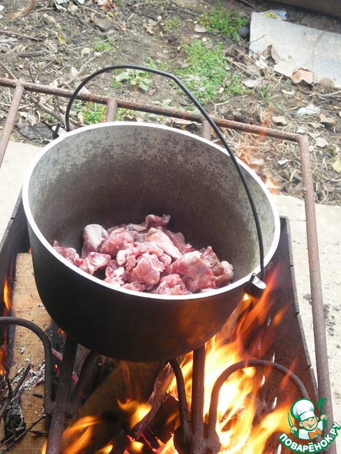 Добавляем в котелок растительное масло и рубленые свиные рёбрышки.