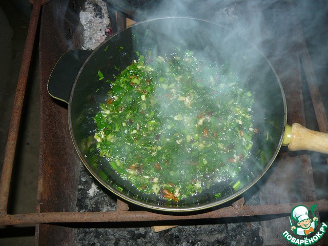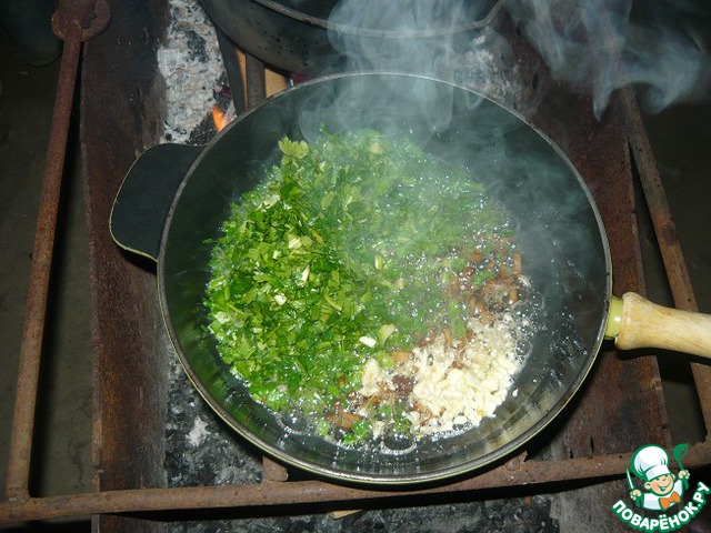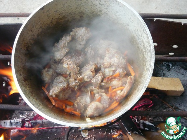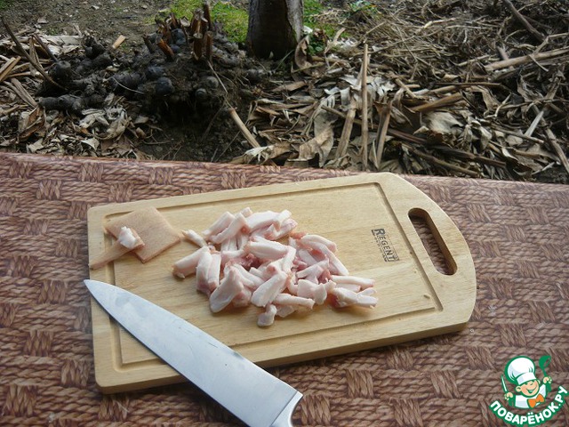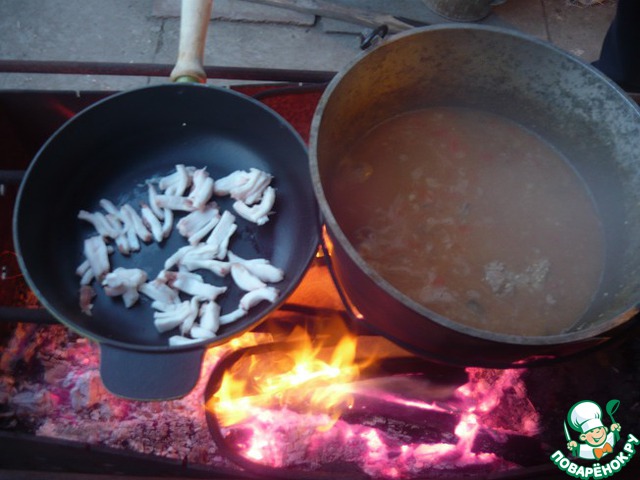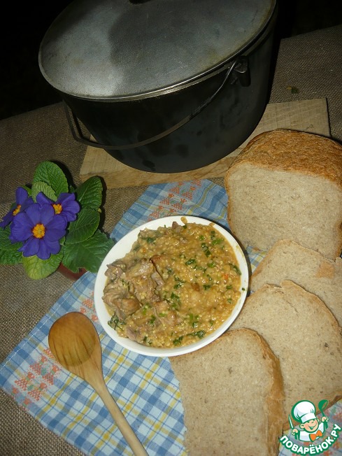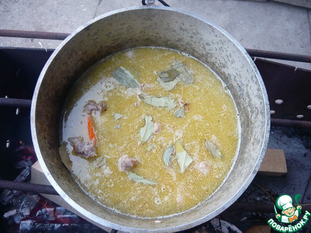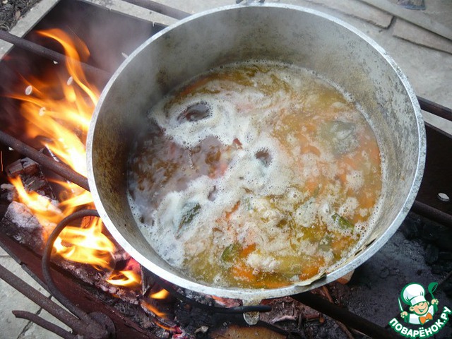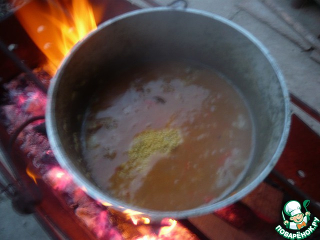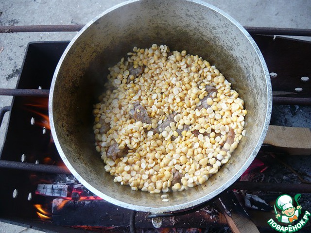 Через час 1ч 20 мин горох разварился полностью, не осталось ни крупинки. Теперь бросаем заниматься огородом и - к костру. Добавляем в котелок подготовленное пшено и молотый перец. Варим до готовности пшена.
