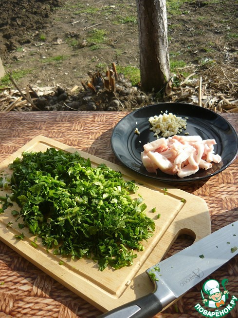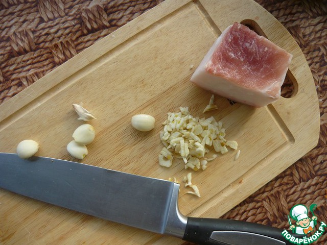 А пока пшено варится, быстро делаем заправку. Мелко рубим чесночок,