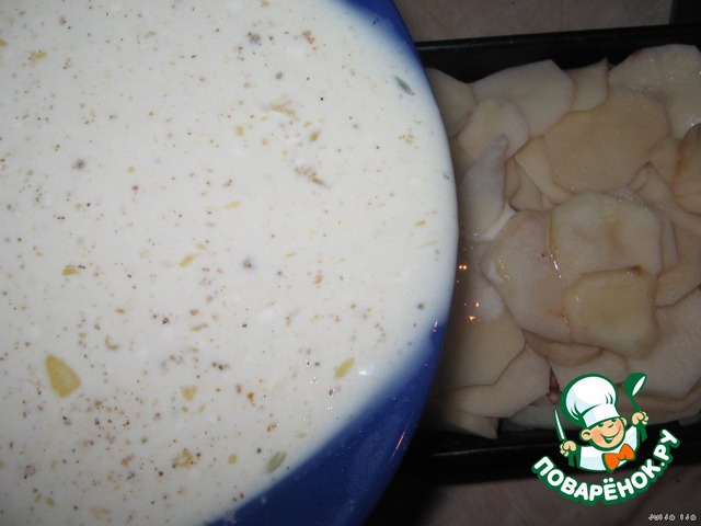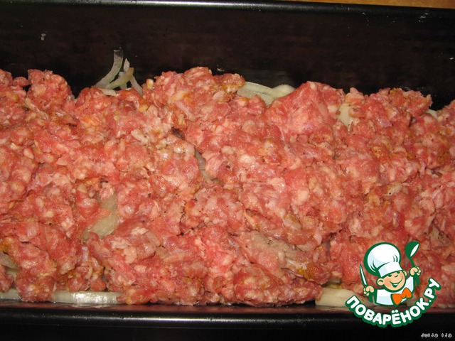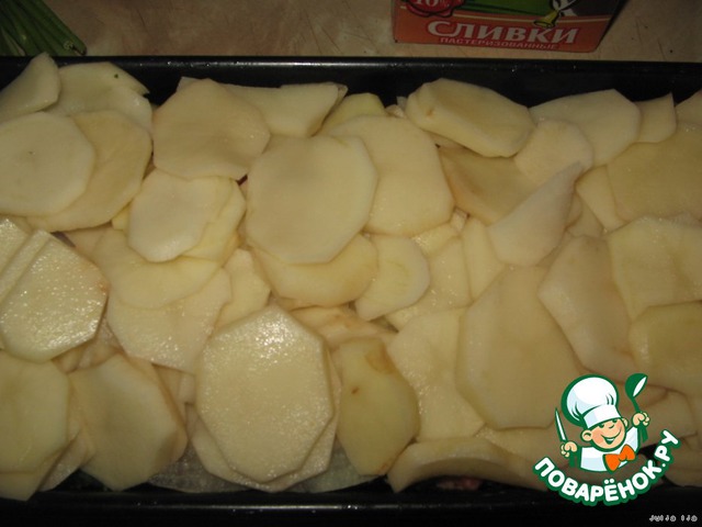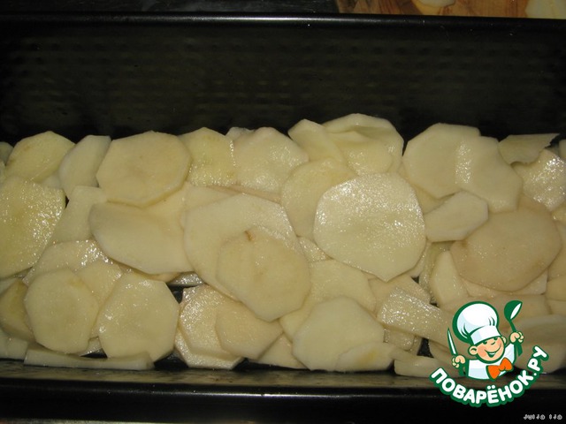В форму, выложить первым слоем - картофель (половину).