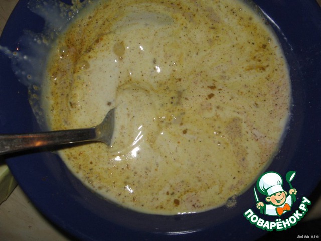 Смешаваем яйцо со сливками. Добавляем в эту смесь соль, перец и карри - по вкусу.