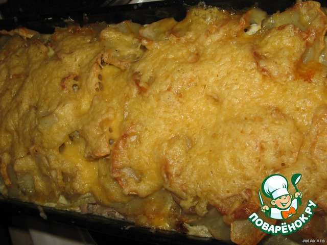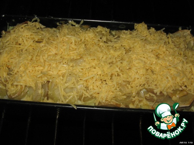 Ставим в разогретую духовку, и готовим при температуре 200 градусов, до готовности картофеля (у меня около часа). За 15 минут до конца выпекания, посыпать натёртым сыром.
