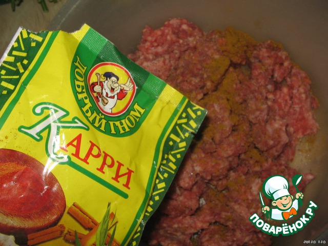В фарш, добавить соль, перец и карри - по вкусу.