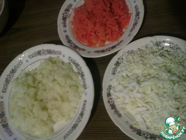 Отварные картофель, морковь и яйца натереть на крупной тёрке. Один желток оставить, ниже объясню.