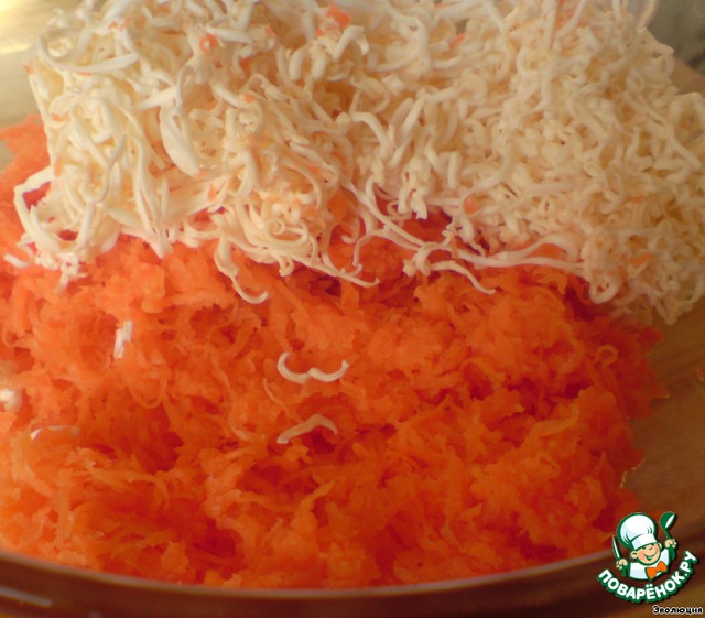 1,5 шт плавленого сырка на этой же мелкой стороне терки. Добавляем к морковке. В нее же давим 2-3 зубчика чеснока и добавляем майонез, чтобы получилась пластичная намазывалка. :-)
