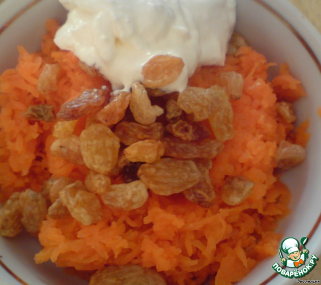 Вареную морковь также пропускаем через мелкую терку. К ней добавляем размоченный в сладком чае белый изюм. Присаливаем, добавляем сметану. Перемешиваем.