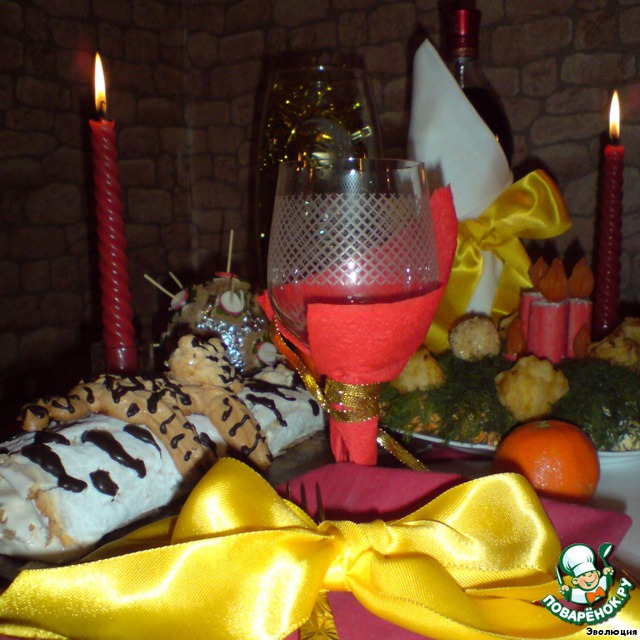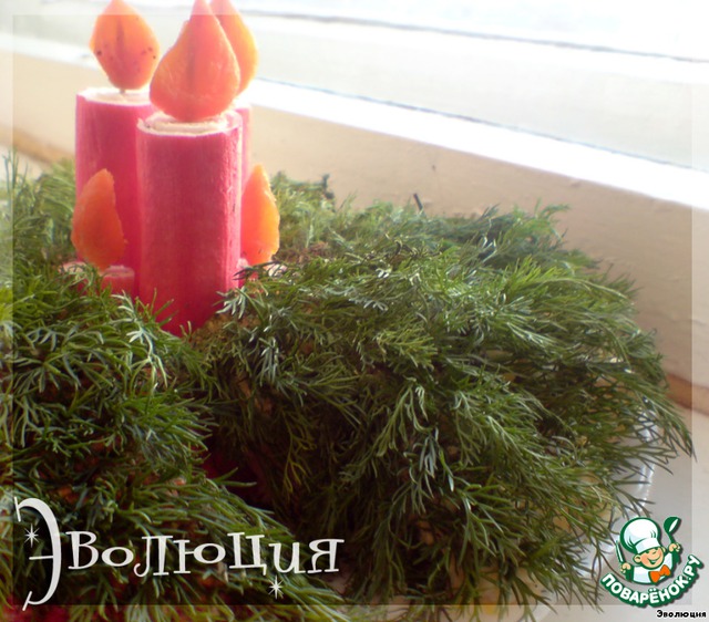 Вы можете в нее положить мандаринчики, я поставила «свечки» из фаршированных крабовых палочек.