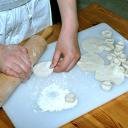 Муку смешать с водой, замесить тесто и оставить на 15 минут. Затем разделить тесто на куски толщиной в 2 см.