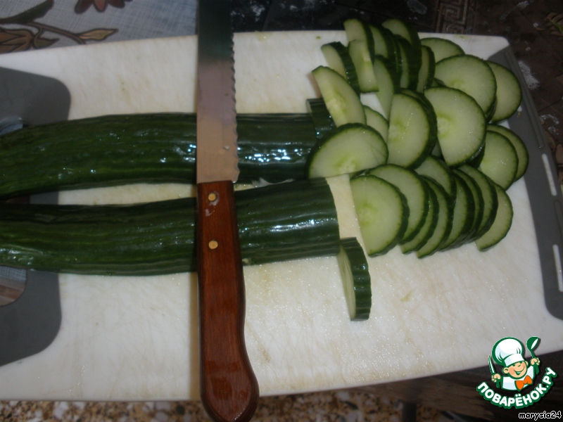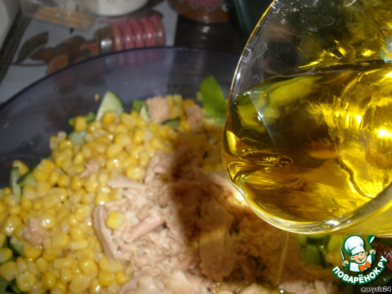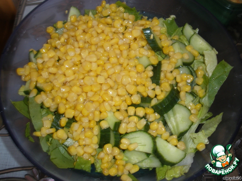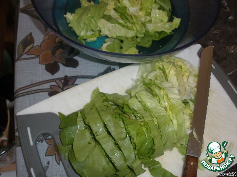 | Воскресенье у нас день гостей. В этот день мы готовим рыбу (вернее, ее готовит муж), сегодня у нас дорадо на костре, а я готовлю всякую закуску и салатики. Салатик очень легкий и всеми любимый, иногда готовлю его просто на ужин. Попробуйте, не пожалеете. |