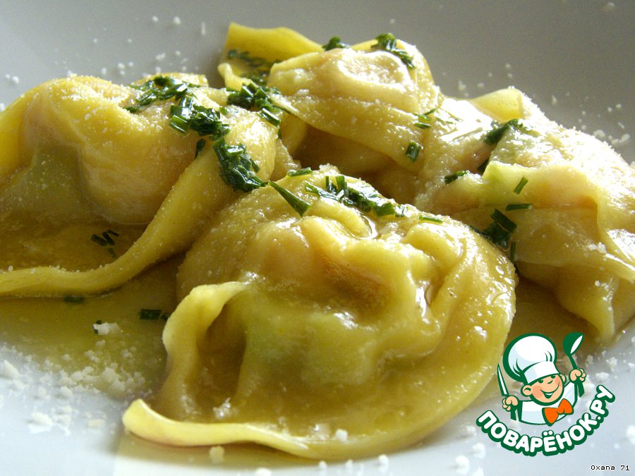 Сливочное масло растапливаем на медленном огне. Добавим в него порезанные зелeные пeрышки лука. Перед подачей тортелли посыплем тeртым сыром Пармезан, а сверху польeм топлeным сливочным маслом.