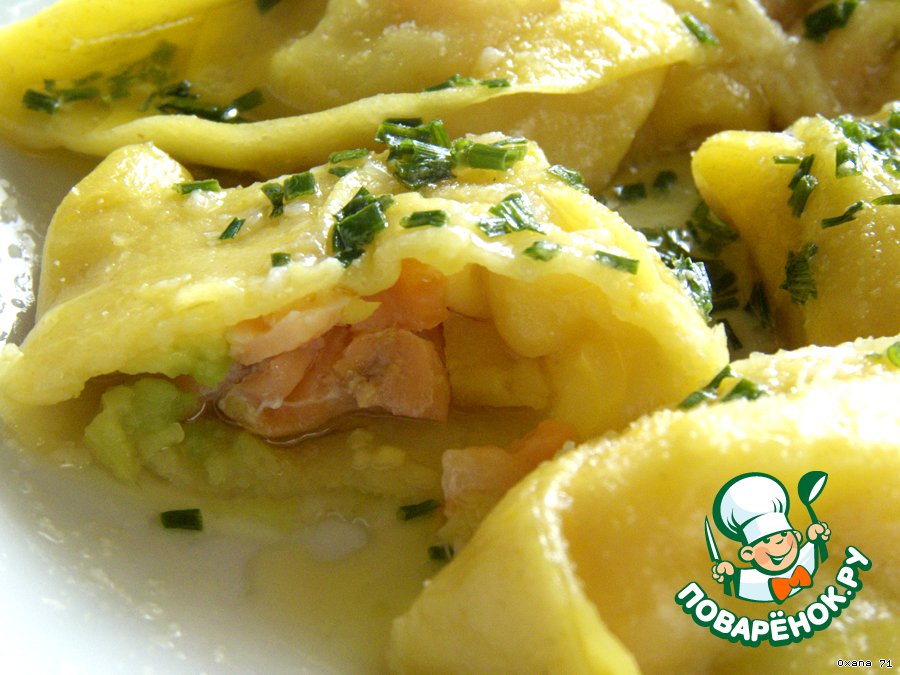 | Очень лeгкие диетические тортелли с начинкой из авокадо и копчeного лосося. |