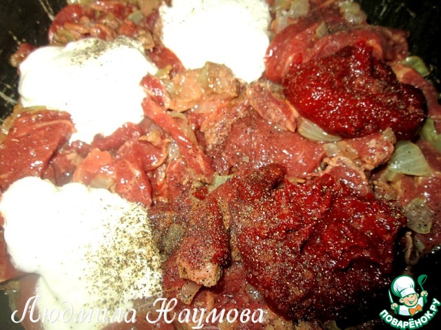 Затем добавить муку, сметану, томатную пасту, соль и перец.