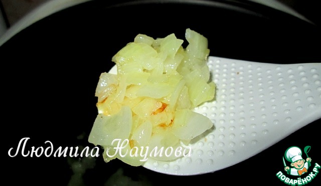 По традиции, лук нарезаем кубиками, обжариваем до золотистого цвета на программе "Жарка овощей".