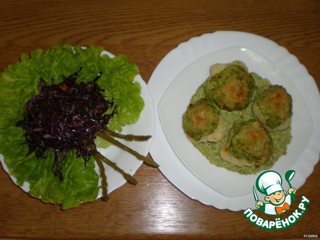 | Рецепт взят из испанского журнала "Я готовлю", в каждом номере повар какого-либо ресторана размещает свои рецепты, на 100 страницах этого журнальчика. Автор назвал его необычно "Зеленая, цветная капуста". Я большой поклонник цветной капусты, но никогда и не подозревала, что соус-пюре из брокколи настолько великолепен. |