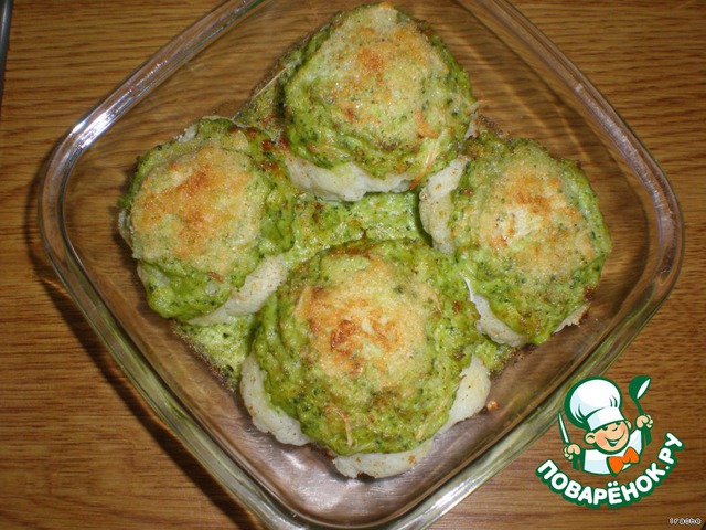 Укладываем в формочку для выпечки, сначала соус-пюре, затем цветную капусту, на верхушку которой наливаем немного соуса и присыпаем небольшим кол-м сыра, в духовку 200 гр. 15 мин.