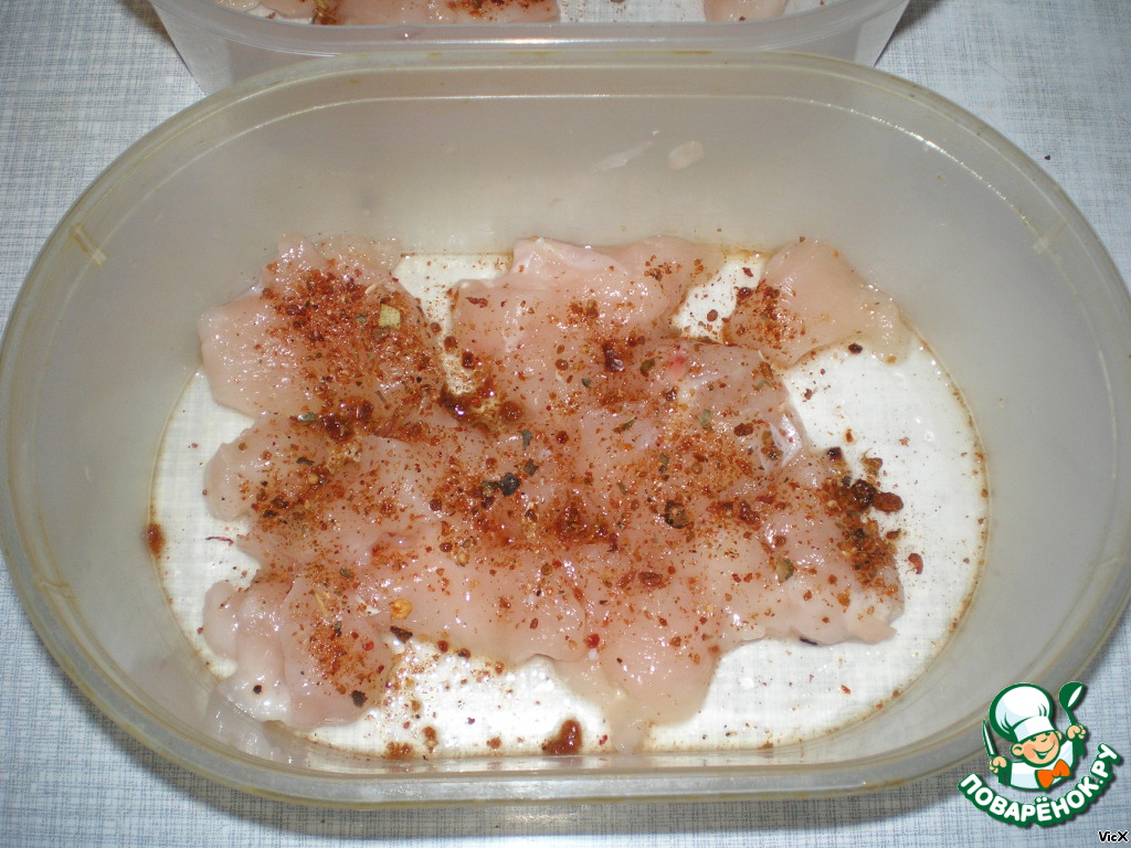Куриное филе режем кубиками, солим и посыпаем специями. Оставляем мариноваться, пока готовим все остальное. Желательно, предварительно замариновать мясо, т.к. в пароварке не получится это уже сделать. Я готовил сразу на две емкости (одна, приблизительно, на две порции).