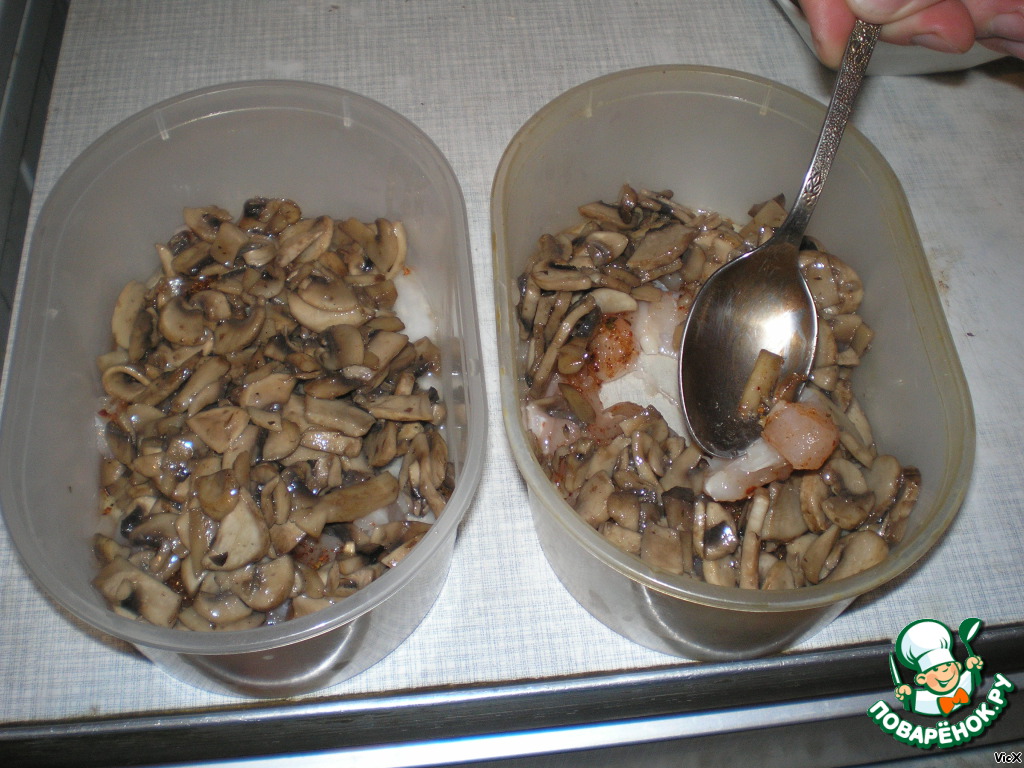 Обжаренные грибы высыпаем в емкость с филе.