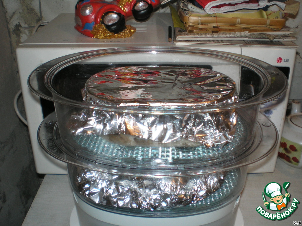 На второй и третий ярус ставим наши судки с готовой смесью, предварительно накрыв их фольгой.