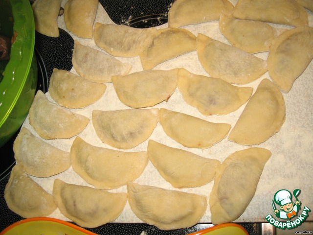 Получившиеся пельмени укладываем на посыпаную мукой доску и ставим в холодное место (я сразу в морозилку клала).