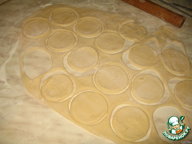 Готовое тесто раскатываем в пласт толщиной 1,5-2 см. И делаем заготовки для пельменей, потом кладем на них фарш (примерно 0,5 ч.л.) и слепливаем.