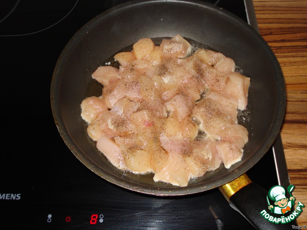 Выкладываем туда филе, солим, перчим и начинаем жарить до светло-золотой корочки, не ужариваем!