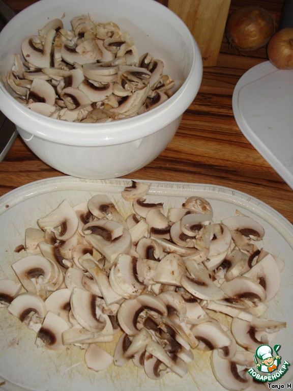 Шампиньоны режем дольками. Когда шампиньоны маленькие, я использую яйцерезку. Тогда они получаются все одинаковые и обжариваются равномерно.
