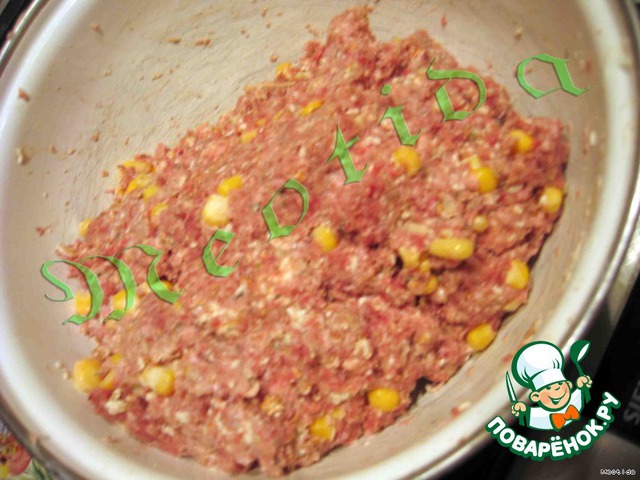 Хорошенько вымешиваем до однородного состояния тесто, добавив, кукурузку, сыр и хлопья.