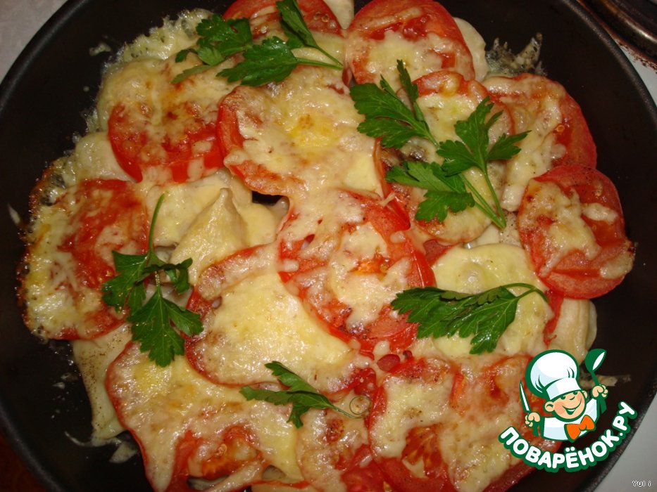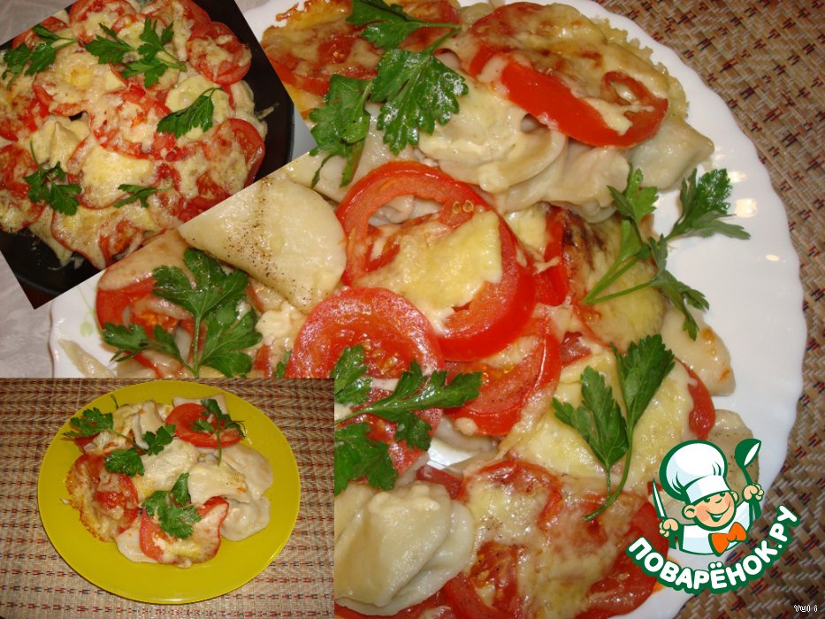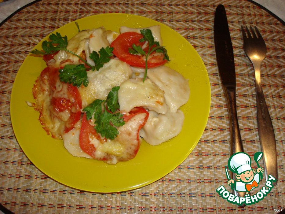 | Любите пельмени и вариации на эту тему - тогда это для вас!!! Пельмени, запеченные с помидором и сыром. Приготовлены мною в спешке - за час до прихода мужа с работы. |