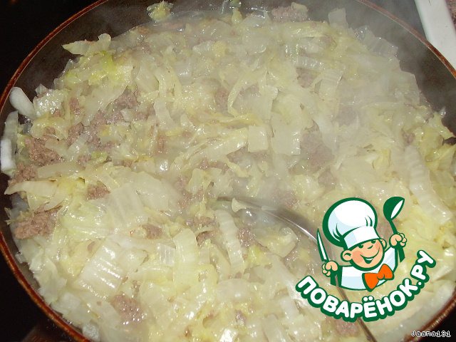 Положить капусту в фарш и добавить воду. Закрыть крышкой и тушить на среднем огне примерно 10 мин. Посолить.